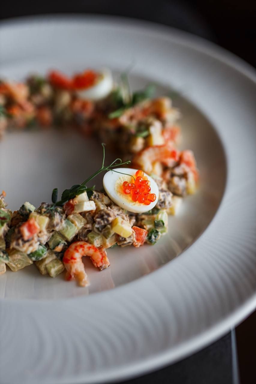 Cалат оливье, утиную грудку с нежным ризотто и рулет из сибаса